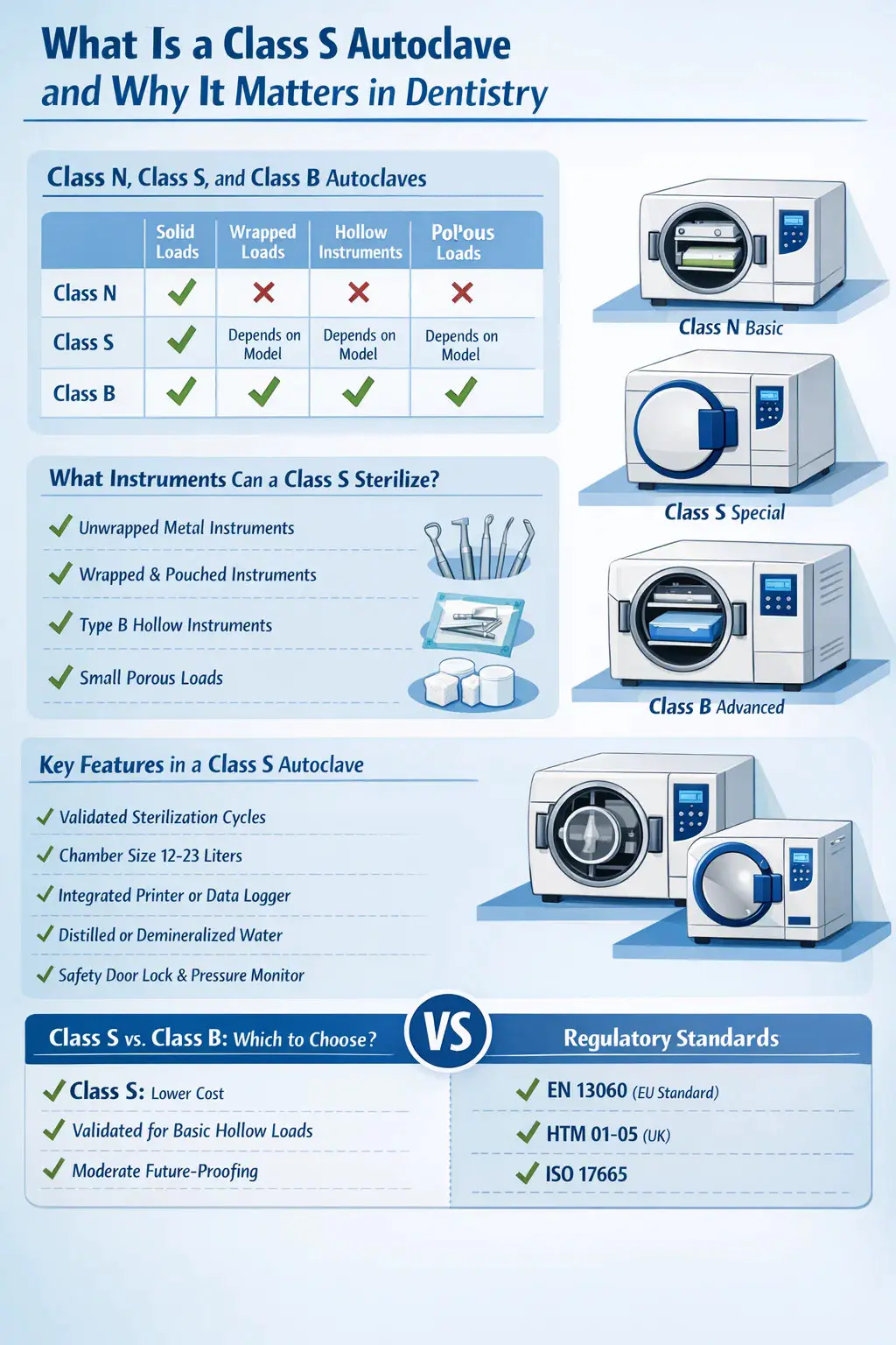 Allerdings bleibt ein Dentalautoklav der Klasse S in bestimmten Szenarien eine sinnvolle Option: als sekundäres Gerät neben einem Klasse-B-Gerät für den Austausch fester Instrumente, in Praxen mit einem sehr begrenzten Instrumentensortiment, das keine kritischen Hohlladungen umfasst, oder in Gerichtsbarkeiten, in denen die Klasse S alle geltenden gesetzlichen Anforderungen für die spezifischen zu verarbeitenden Instrumente erfüllt.