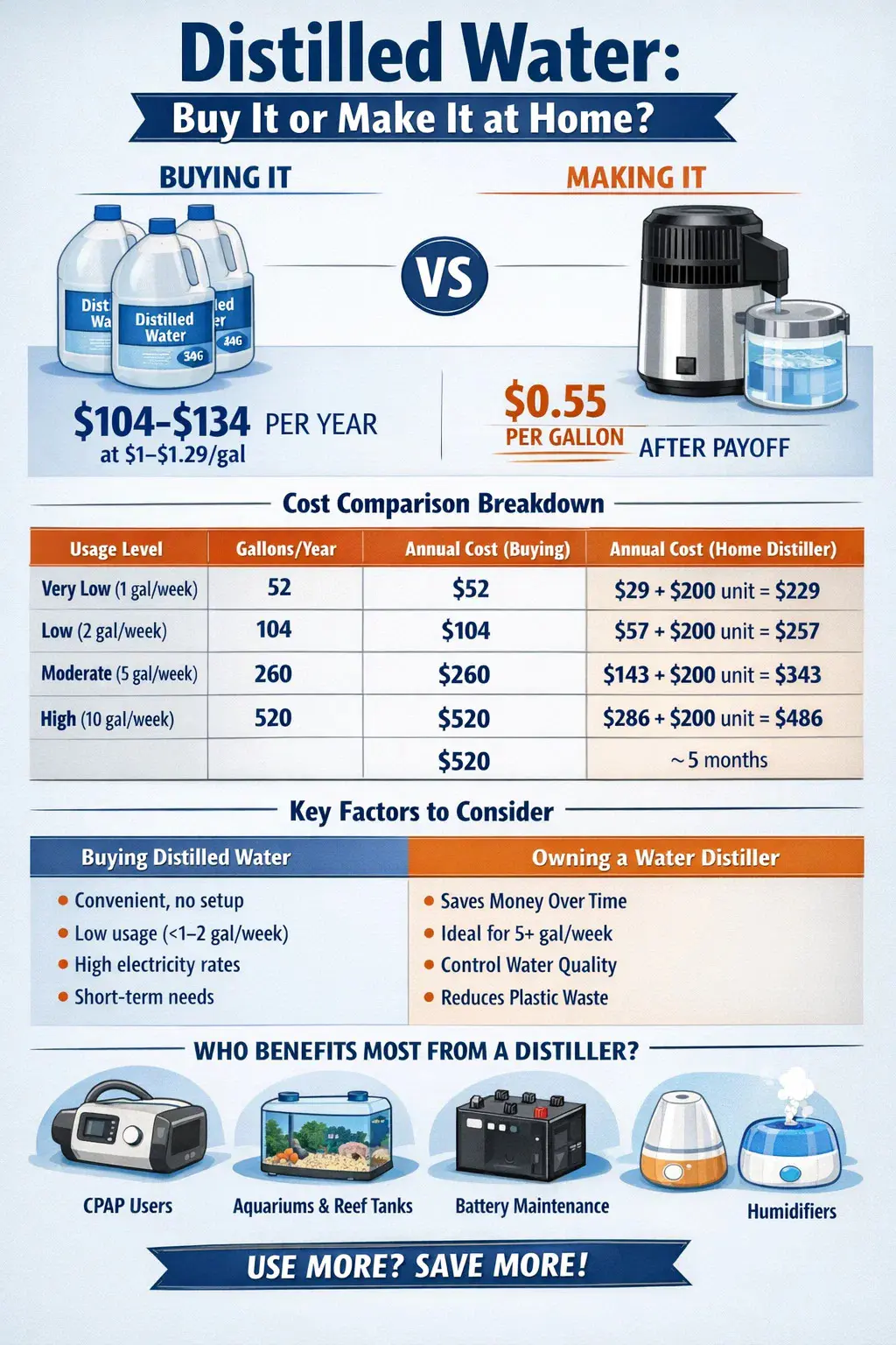 Allerdings ist die Mathematik nicht für alle gleich. Wenn Sie nur gelegentlich einen Liter Wasser für Ihr Bügeleisen oder Ihren Luftbefeuchter benötigen, ist der Kauf durchaus sinnvoll. Wenn Sie jede Nacht ein CPAP-Gerät betreiben, ein großes Aquarium füllen oder wöchentlich eine Batteriebank auffüllen, amortisiert sich ein Wasserdestilliergerät für zu Hause schnell und spart Ihnen über Jahre hinweg Geld.