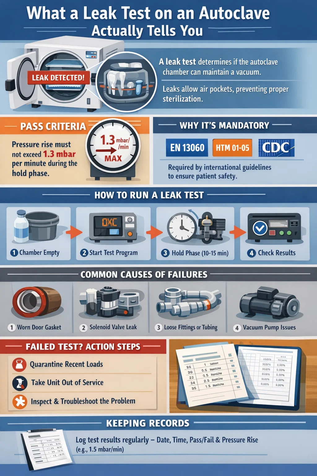 Wenn ein Dentalautoklav die Dichtheitsprüfung nicht besteht, liegt die Ursache fast immer in einem vorhersehbaren Satz von Komponenten. Wenn Sie wissen, wo Sie zuerst suchen müssen, sparen Sie viel Zeit bei der Diagnose.