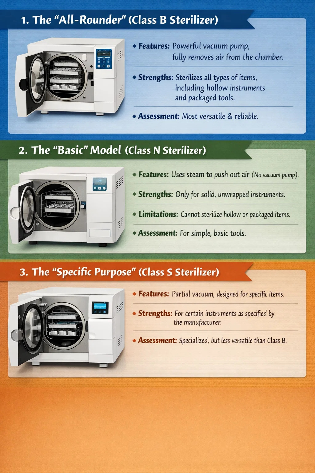 Obwohl die in Zahnkliniken verwendeten Sterilisationsgeräte ähnlich aussehen mögen, sind diese Dentalautoklaven werden typischerweise in drei Hauptkategorien eingeteilt, je nachdem, wie sie mit Luft umgehen und welche Fähigkeiten sie haben.