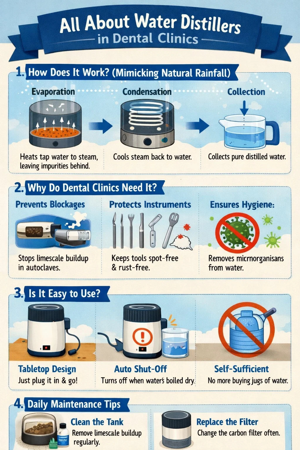 A Wasserdestilliergerät ist im Wesentlichen eine kleine Fabrik, die sich der Herstellung von „reinem Wasser“ widmet. In Zahnkliniken ist es normalerweise der beste Partner für Dentalautoklaven, da Autoklaven sehr „wählerisch“ sind, was das von ihnen verwendete Wasser angeht und nur dieses saubere destillierte Wasser verwenden kann.