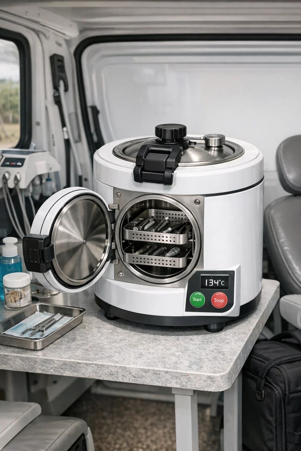 Außenanwendungen: In einigen kostenlosen Kliniken und mobilen medizinischen Diensten in abgelegenen Gebieten kann medizinisches Personal es problemlos in seinen Fahrzeugen mitnehmen. Überall dort, wo eine Stromquelle vorhanden ist, kann sofort ein Miniatur-Instrumentenbearbeitungszentrum aufgebaut werden. Laienhaft ausgedrückt: Es ist wie ein professioneller „Sterilisationskoffer“, der die Sauberkeitsgarantie über einen kleinen, festen Sterilisationsraum hinaus erweitert.