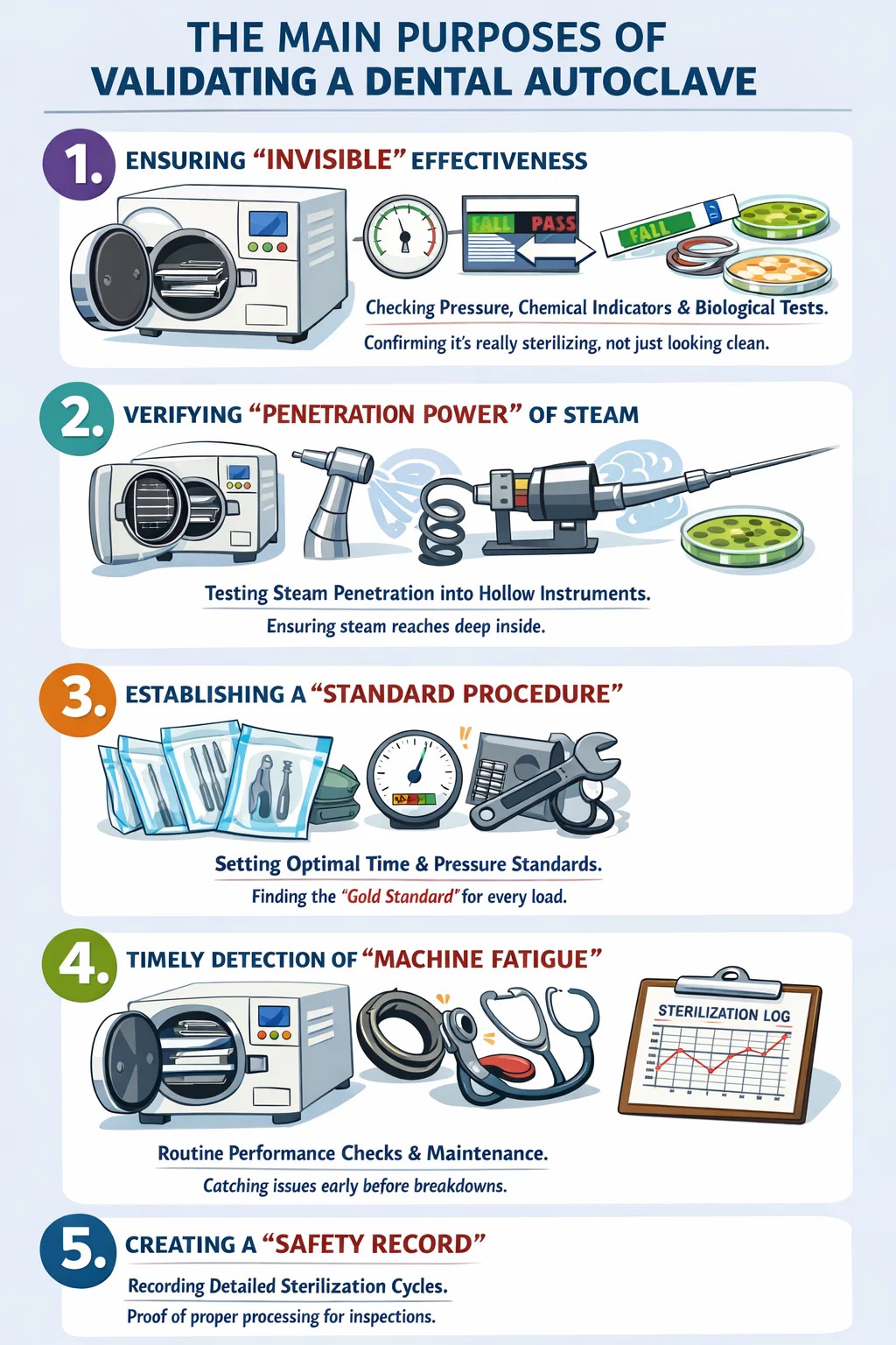 Die Validierung von a Dentalautoklav Vereinfacht gesagt soll die Sterilisationswirkung „doppelt gewährleistet“ werden. Obwohl die Maschine jeden Tag läuft, stellt die Validierung sicher, dass sie ihre Arbeit jedes Mal effektiv erledigt.